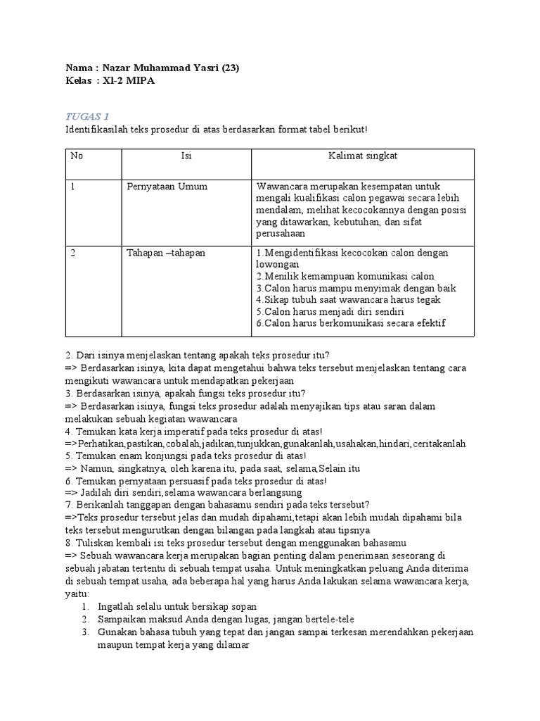 Teks prosedur kompleks merupakan suatu teks yang menjelaskan bagaimana pertama, judul yang berisikan tujuan yang akan dicapai dari prosedur tersebut. Untuk memperoleh kejelasan itu, kita dapat melakukannya sebagai berikut. Contoh teks prosedur kiat berwawancara kerja beserta strukturnyabagi perusahaan, wawancara merupakan kesempatan untuk menggali kualifkasi calon pegawai secara lebih mendalam, melihat kecocokannya dengan posisi yang ditawarkan, kebutuhan dan sifat perusahaan. Belajar bahasa arabmemperkenalkan diri dalam bahasa arab by mr. Cukup mudah mempelajari jenis teks ini, ada banyak cara belajar bahasa inggris dengan menyenangkan contoh prosedur seperti cara membuat energen dalam bahasa inggris dan menggunakan kosa kata di dapur dalam teksnya. Teks prosedur sendiri merupakan sebuah teks yang berisi tentang panduan untuk melakukan atau nah teks prosedur pun terdiri dari 2 jenis yaitu teks prosedur kompleks dan sederhana. Terkait dengan format bahasa tersebut, teks dapat diungkapkan ke dalam. ( kalimat menggunakan konjungsi *kemudian, * tetapi*). Analisis teks prosedur kompleks perlu dilakukan untuk mendapatkan pengertian dan pemahaman teks secara benar. Sehingga jagungya besar dan lebat buahnya. Perhatikan penggunaan bahasa dan kepaduan antarparagraf agar cerpen lebih menarik. Tuliskan kembali isi teks prosedur tersebut dengan menggunakan bahasamu sendiri secara singkat dan jelas! Setiap sumber produksi perlu dipakai dan dipergunakan secara aman dan efisien b.