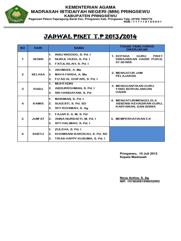 Disini saya akan share contoh jadwal piket kelas yang kreatif, unik, dan menarik yang dibuat dalam format microsoft word (doc) dan juga dengan excel. Sk ini di kemudian hari, dapat digunakan sebagai bukti fisik sah untuk memenuhi beban mengajar. Oleh diposting pada 16 desember 2014 Sehingga terciptalah proses belajar mengajar yang nyaman santai dan fokus. Pengumuman formulir ppdb dan cara mengisinya. 15 tahun 2018 pasal 6. Contoh format buku piket harian guru paud tk kober tpa administrasi paud. Contoh format buku piket harian guru paud tk kober tpa. Menyediakan agenda kelas, agenda piket, surat izin masuk/keluar, agenda guru (yang berisi: jadwal pelajaran, kontrak belajar dengan siswa, absensi siswa, form catatan pertemuan dan materi guru, daftar nilai, dan form home visit) penyusunan program kbm dan analisis mata pelajaran; Contoh jadwal piket kelas contoh jadwal piket kelas untuk guru kelas wali kelas yang ingin berkreasi dalam pembuatan jadwal piket kelas disekolahnya. Sampai disini selesai sudah kita membuat jadwal piket dengan menggunakna microsoft word. Di deretan menu atas, klik tata usaha di kolom kepegawaian, klik guru piket klik tombol.
